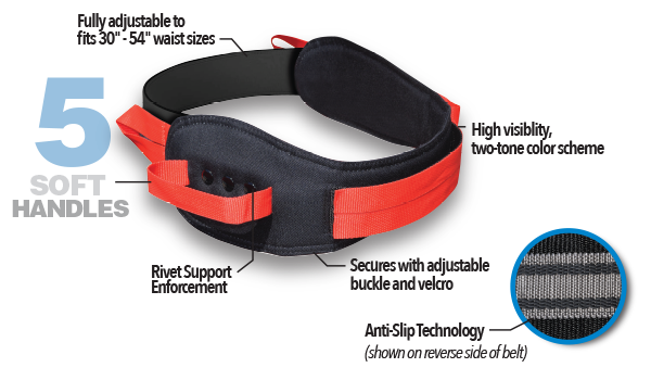 The belt can be used for transfers from one setting to another, including chairs to bed, bed to toilet and chair to cars. Walking and ambulation are easier with greater safety by using the horizontal and vertical handles of the belt.